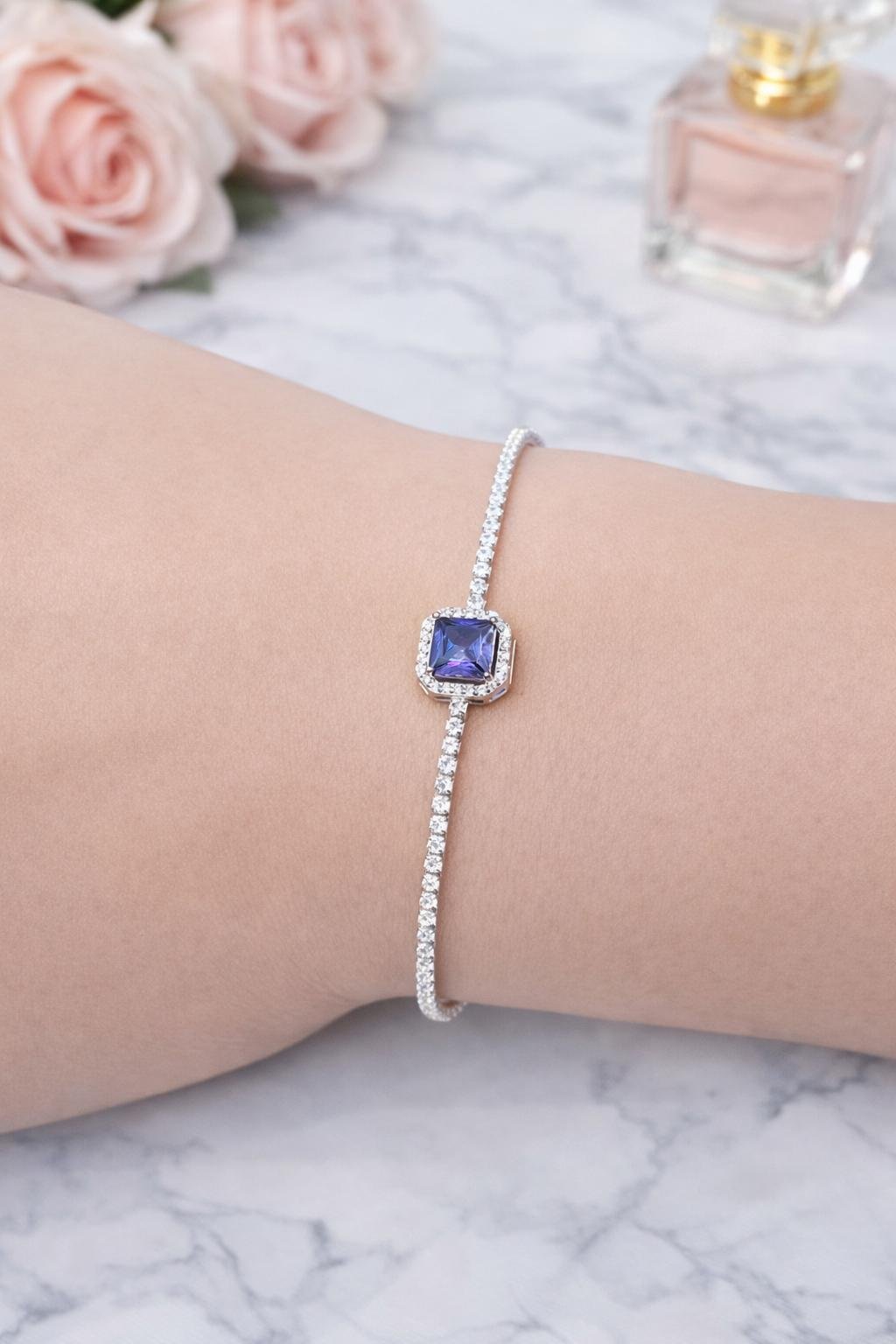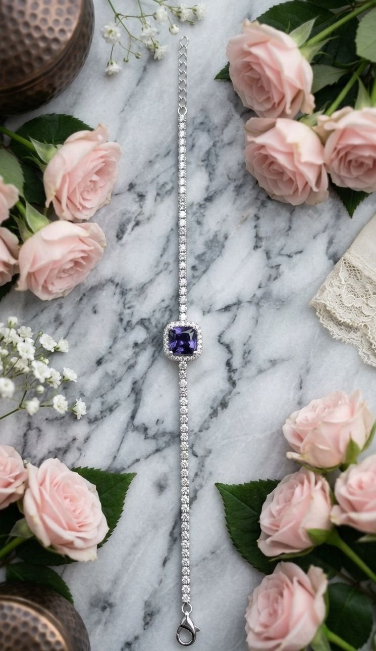 The princess-cut center stone reflects light beautifully, symbolizing confidence and grace. This 925 Sterling Silver Princess-Cut Sapphire Crystal Bracelet is perfect for: