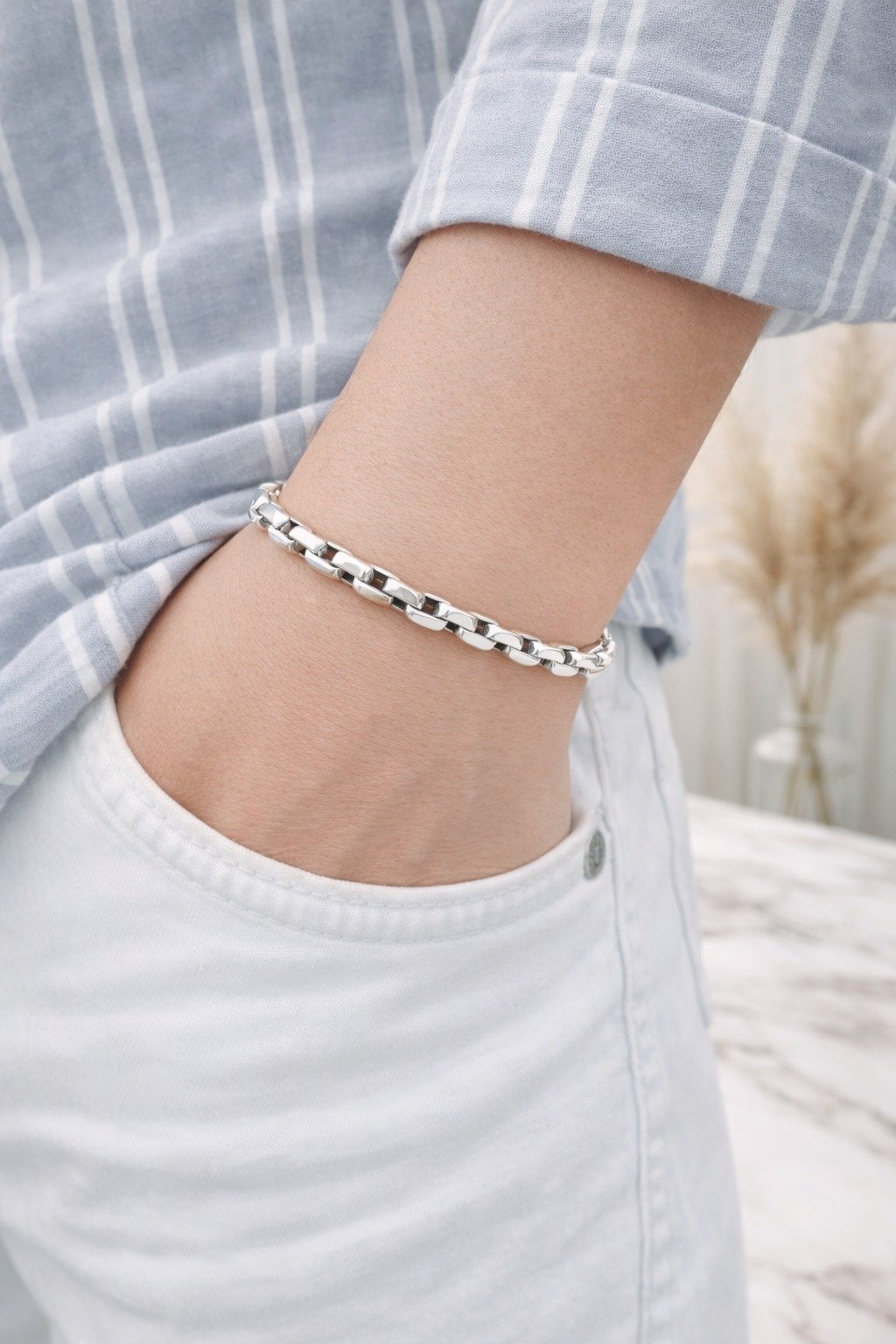 The Urban Classic design makes this bracelet extremely versatile. Whether paired with casual outfits like jeans and shirts or styled with formal wear for business meetings and special occasions, it enhances your overall look effortlessly. Its clean and elegant chain structure makes it suitable for men who prefer understated luxury without heavy detailing.