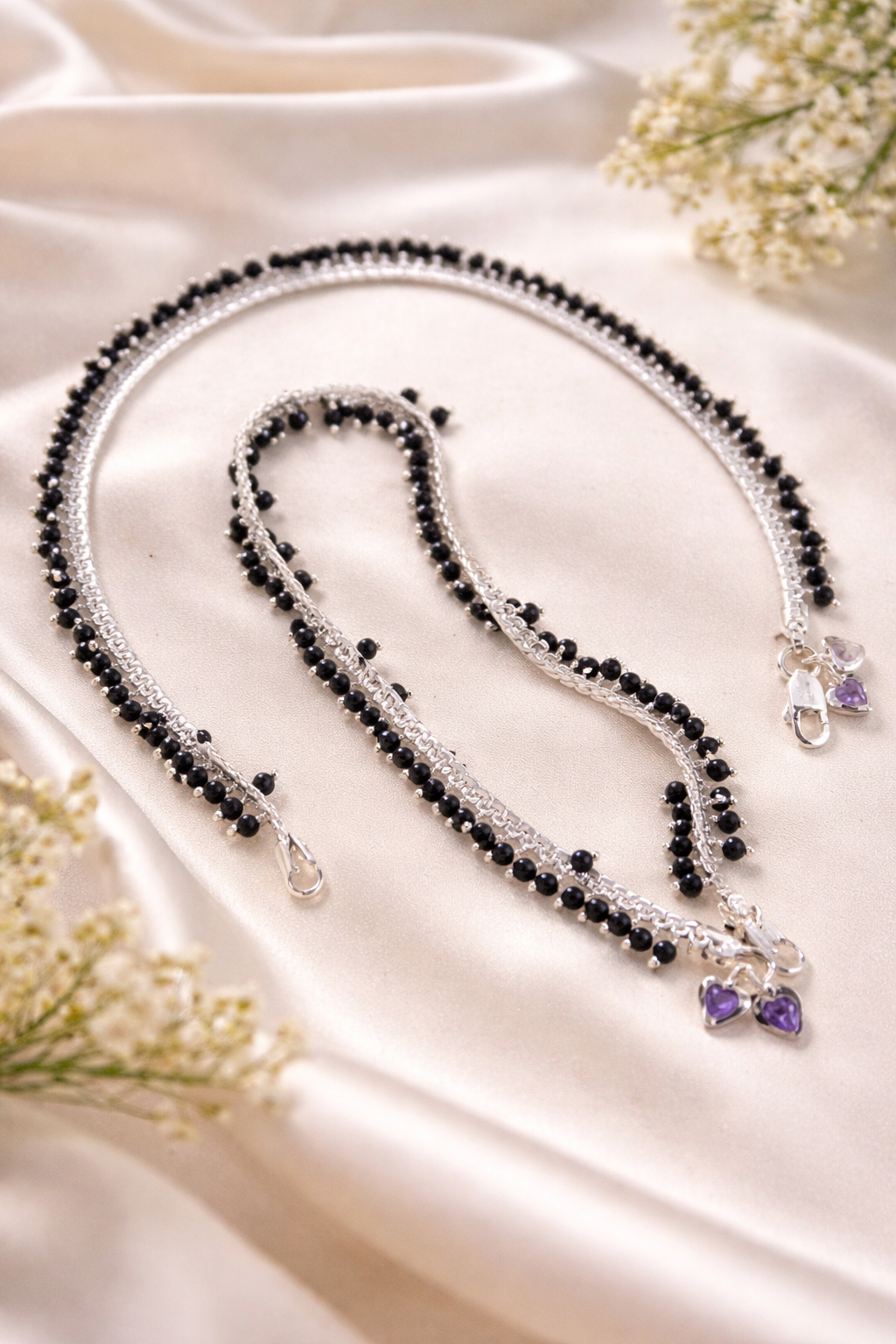 Elegant black bead silver anklet with twin heart charm. Lightweight, stylish, and perfect for daily wear or gifting.
