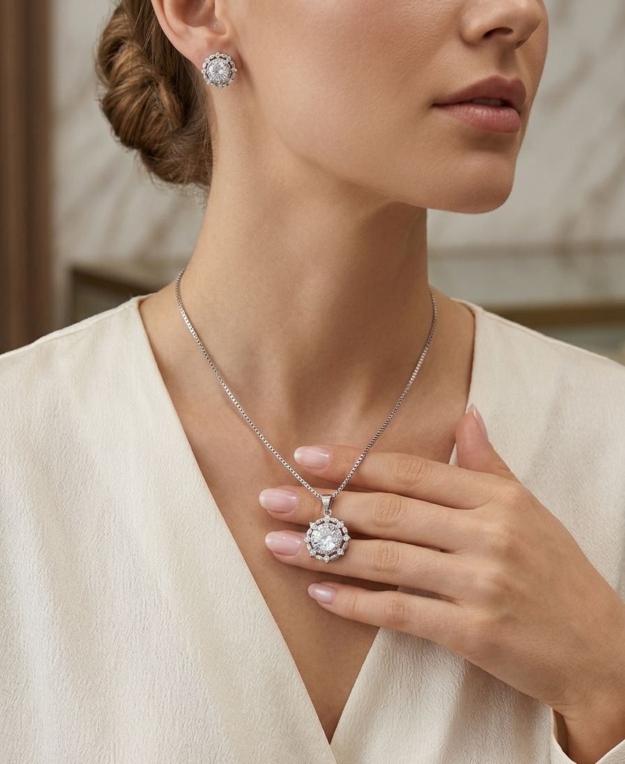 ✨ Key Features of Classic Round Halo CZ Silver Necklace Set