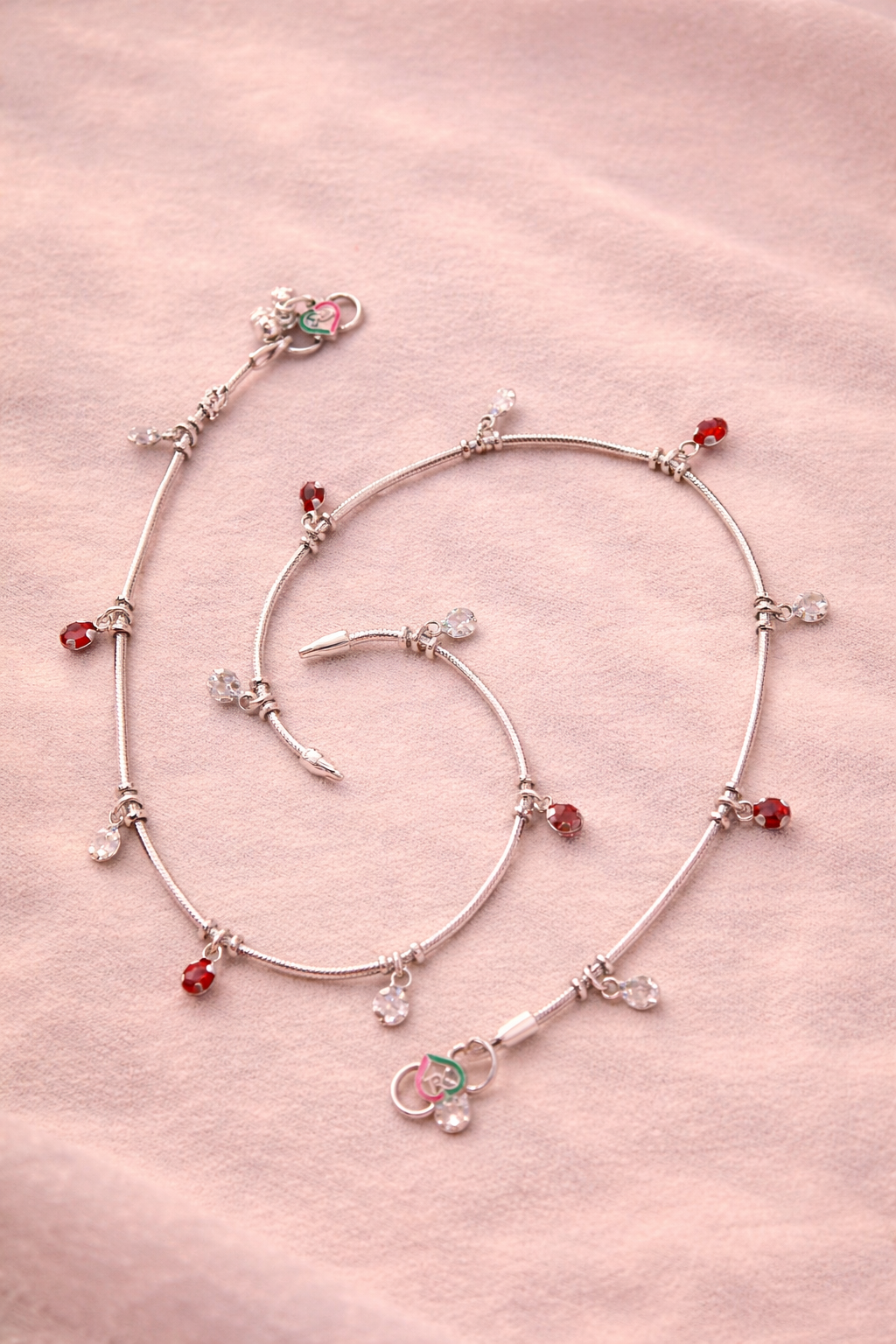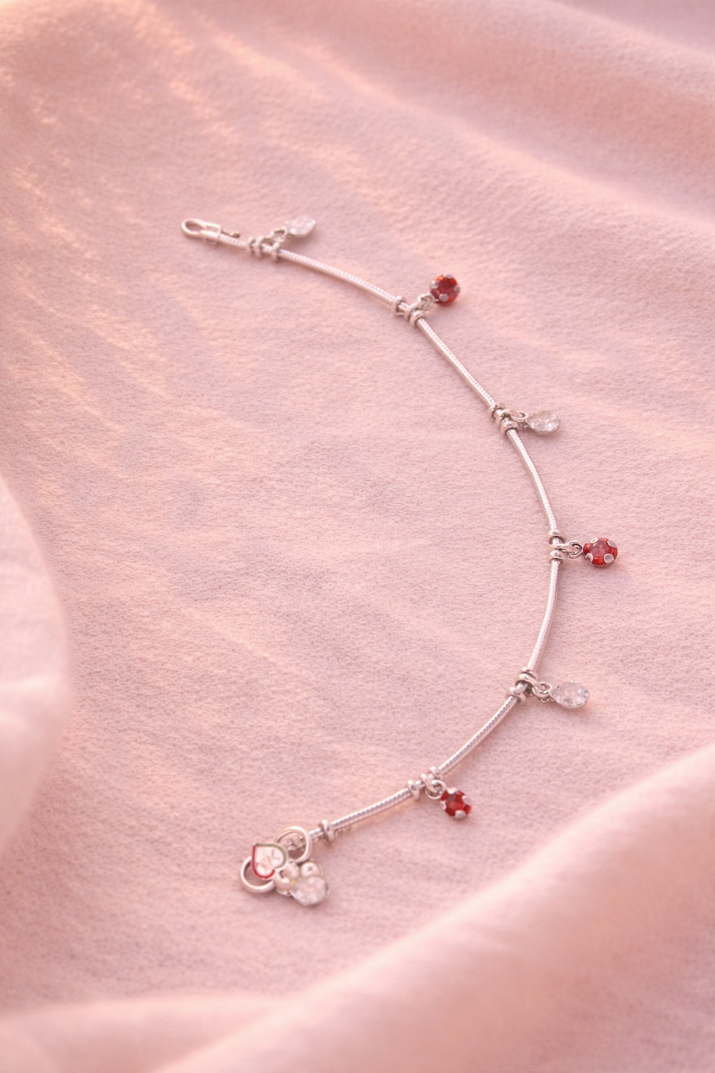 The Elegant Red & Crystal Charm Silver Anklet for Women Silveradda is a perfect blend of grace, style, and modern design. Crafted for women who love delicate yet eye-catching jewelry, this anklet features beautifully placed red and white crystal charms that add a subtle sparkle to your overall look.