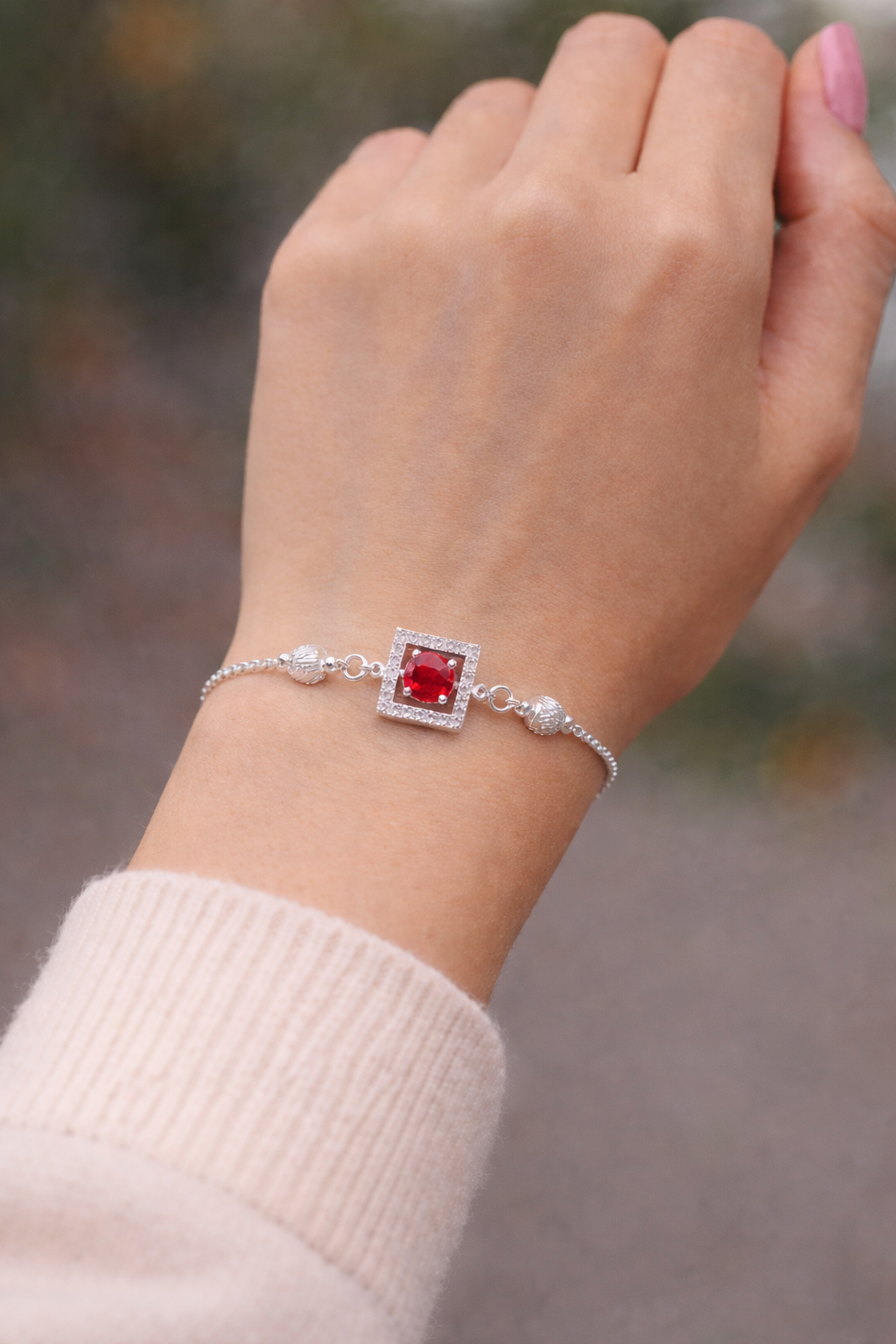 This beautiful Red Gemstone Silver Bracelet features a bright red stone placed in a square frame. Small sparkling stones surround the center gem and create a luxurious look. The delicate silver chain with decorative beads gives the bracelet a graceful and modern style.