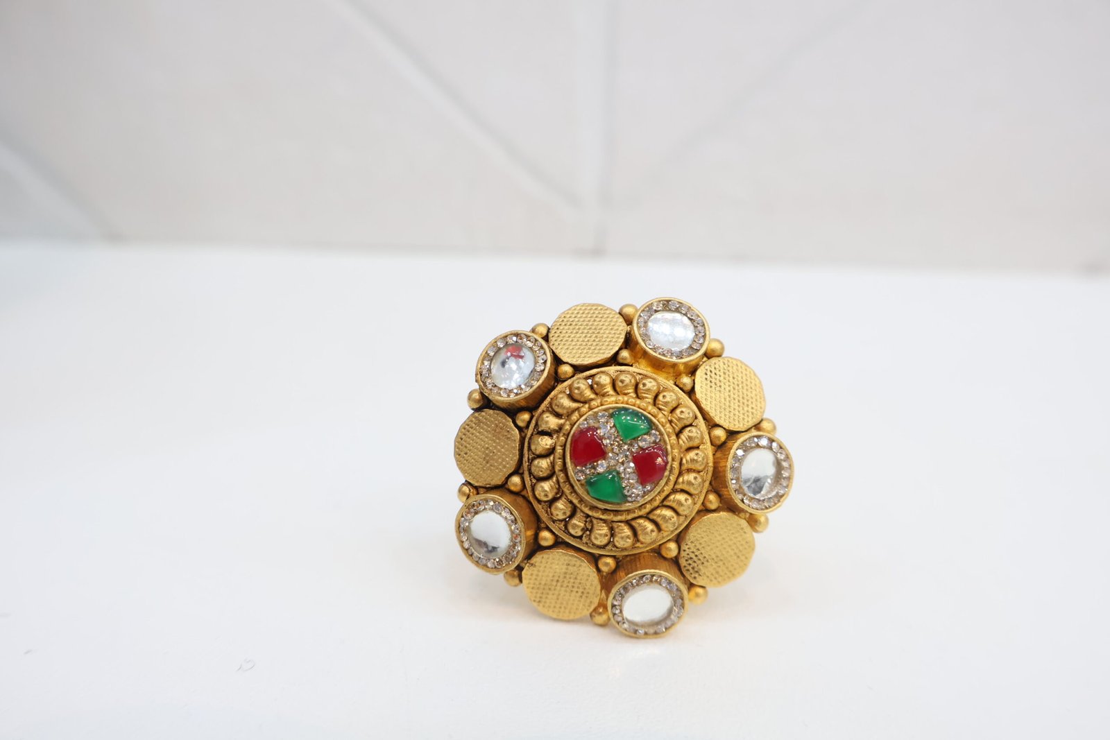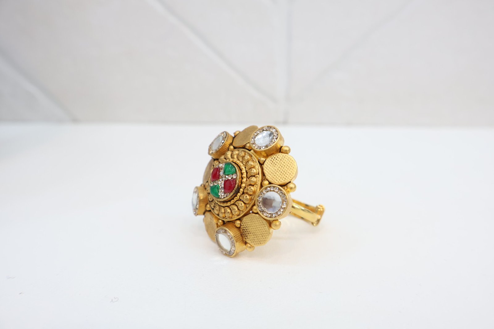 Elevate your traditional look with this Ethnic Gold-Plated Kundan Ring, beautifully crafted to add a splash of color and elegance. Featuring a multicolor enamel center, this ring is the perfect accessory to complement your ethnic wardrobe. Ideal for weddings, festivals, or festive gatherings, it brings a touch of royal charm to your ensemble.