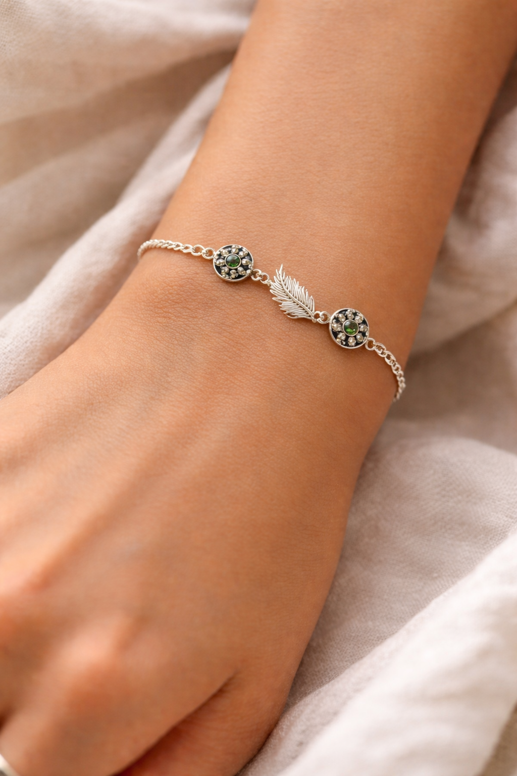 The Green Stone Feather Charm 925 Sterling Silver Bracelet matches many outfits. You can wear it with casual clothes, office wear, or party dresses. It adds a subtle yet stylish touch to your overall look.
