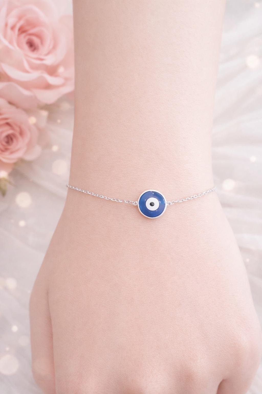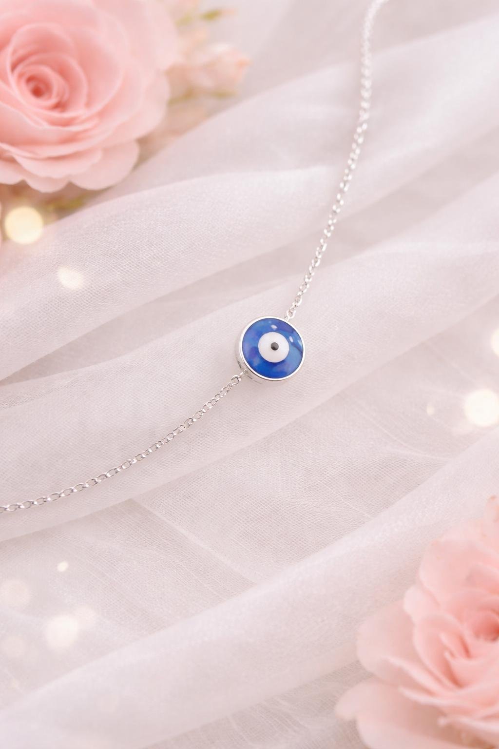 The centerpiece of this bracelet features a classic blue evil eye charm, known for symbolizing protection, positivity, and good fortune. The smooth round design is set in high-quality silver, creating a refined and sophisticated look. The delicate chain enhances its minimal elegance, making this Evil Eye Silver Bracelet perfect for everyday wear.