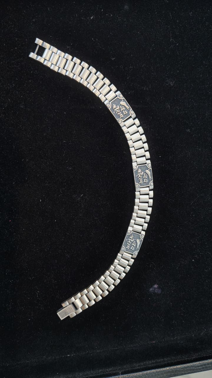 The polished finish enhances its premium appeal while maintaining a masculine and stylish look. Whether paired with traditional attire during religious occasions or worn casually with shirts and jeans, this silver bracelet complements every outfit effortlessly.