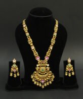 The antique gold-plated finish gives the set a vintage appeal, while the floral pendant adds a delicate touch of femininity. Each bead and pendant is meticulously crafted, reflecting the rich heritage of South Indian jewellery craftsmanship. The layered design of the multi-strand necklace enhances its grandeur, making it an ideal choice for brides or anyone looking to elevate their festive attire.