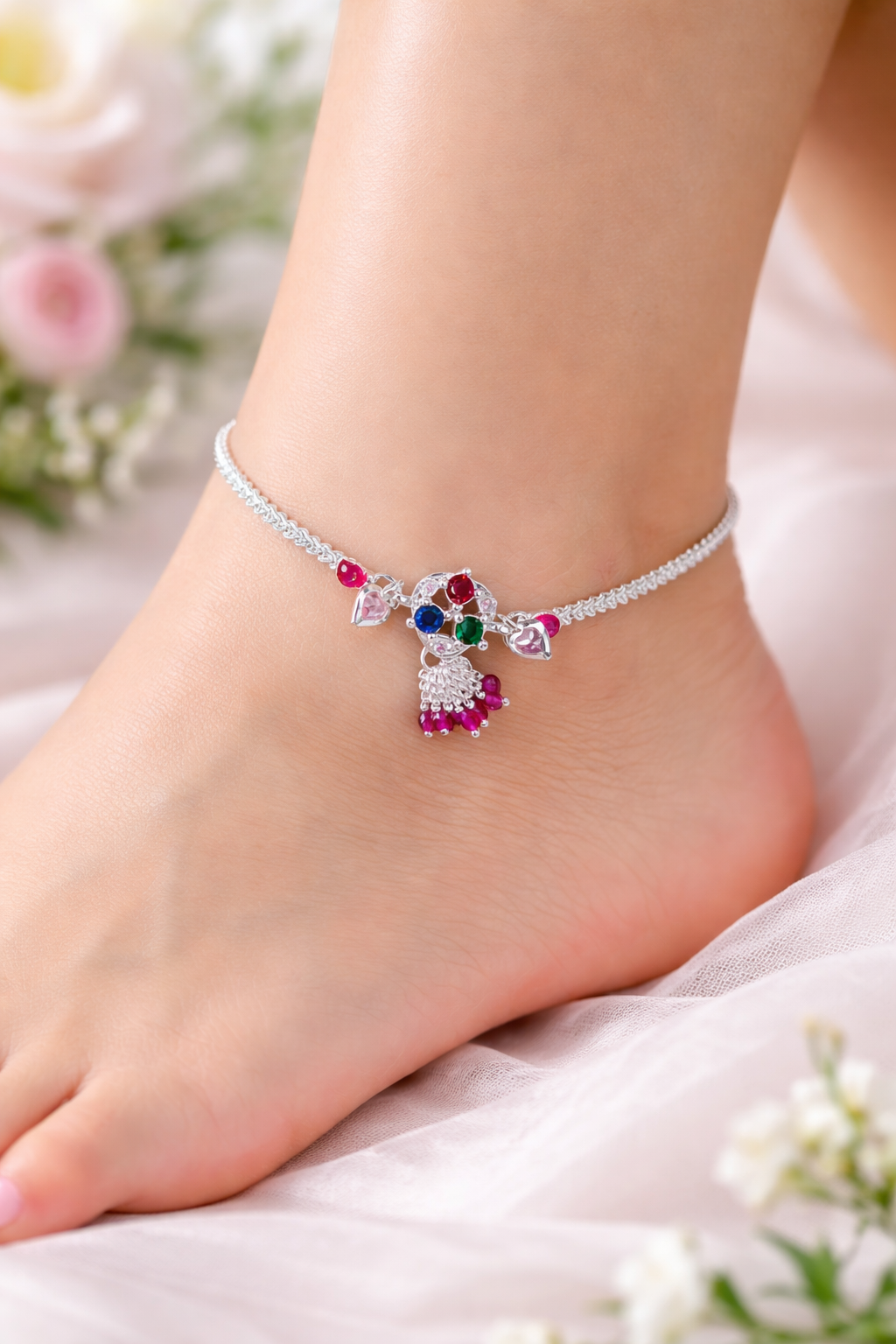 Enhance your style with this beautiful multicolor silver anklet, designed for women who love elegant and trendy jewelry. This anklet features colorful stones and delicate dangling beads that create a perfect blend of traditional and modern design.