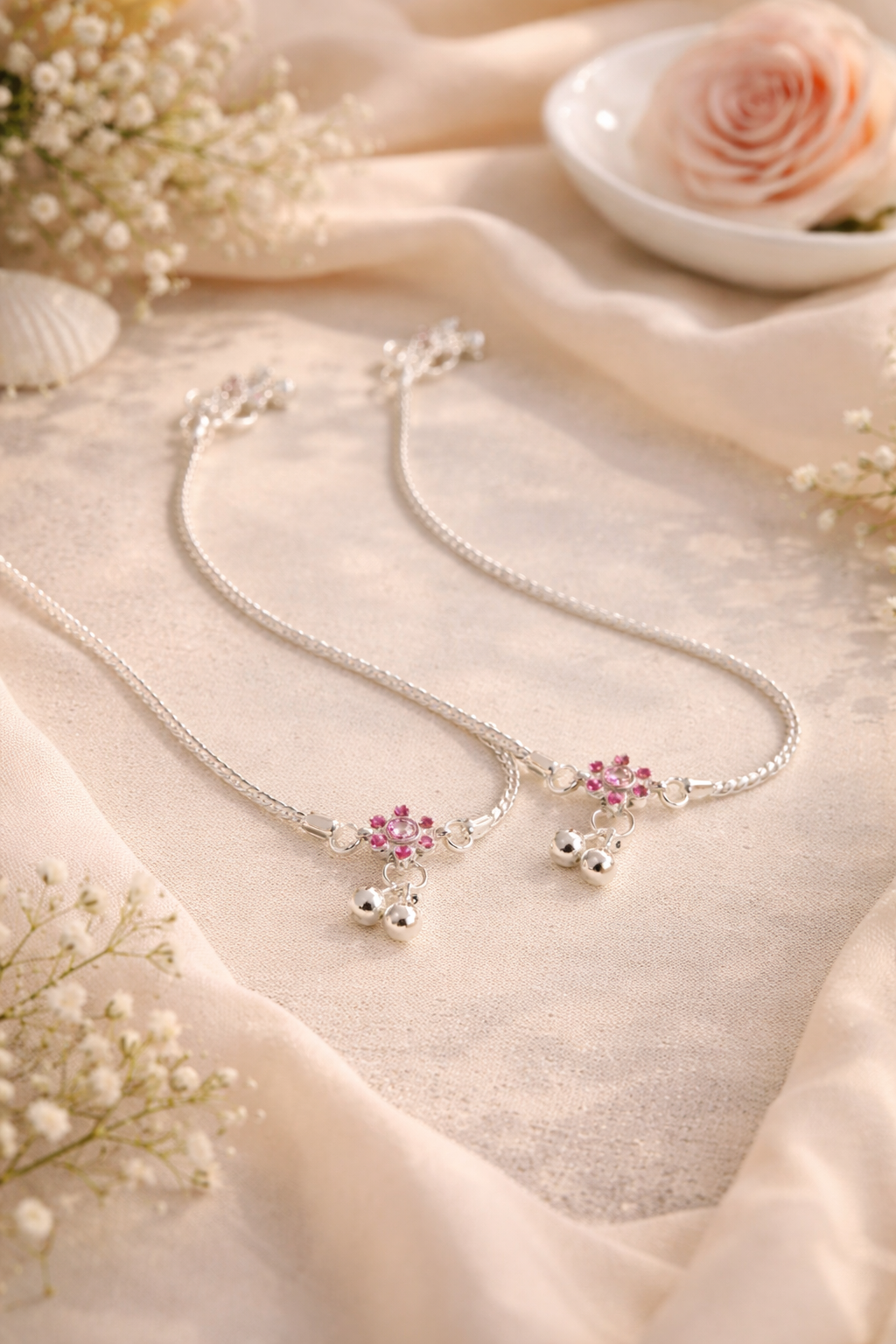 Elegant pink flower charm silver anklet for women. Lightweight, stylish and perfect for daily and festive wear.