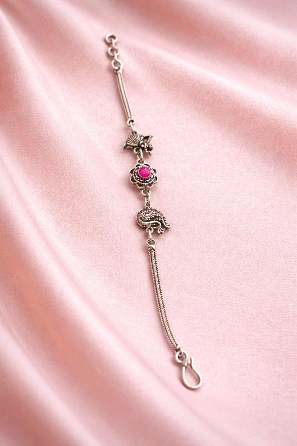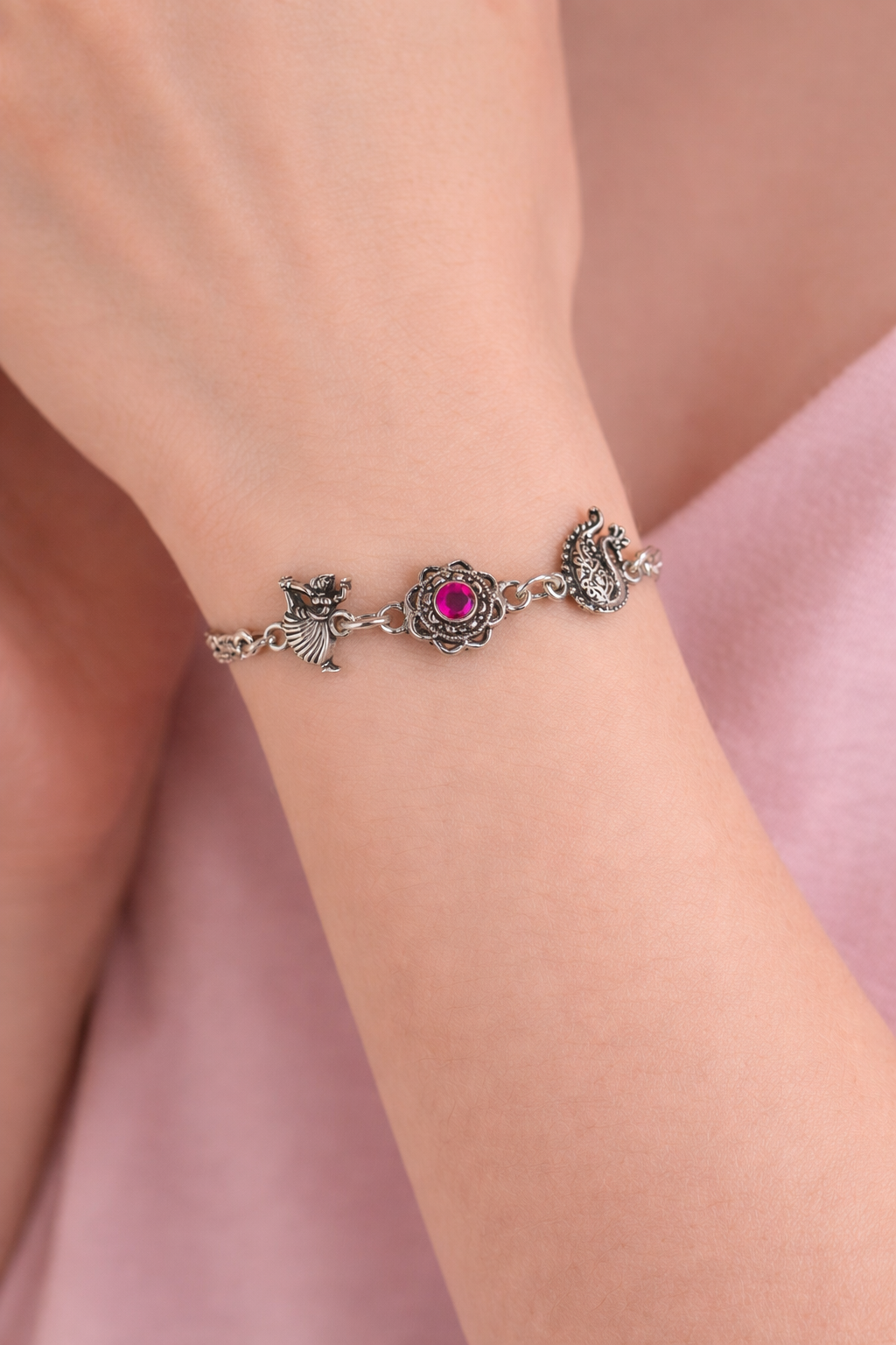 This Pink Stone Silver Bracelet is lightweight and comfortable, making it easy to wear throughout the day without any discomfort. The secure clasp ensures a perfect fit, while the fine silver chain enhances its elegant appeal. Whether you are dressing up for a festive occasion, a casual outing, or gifting someone special, this bracelet is a perfect choice.