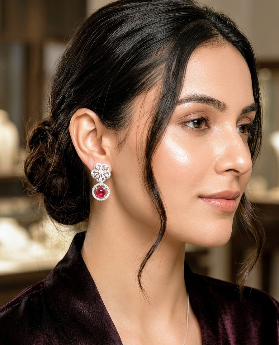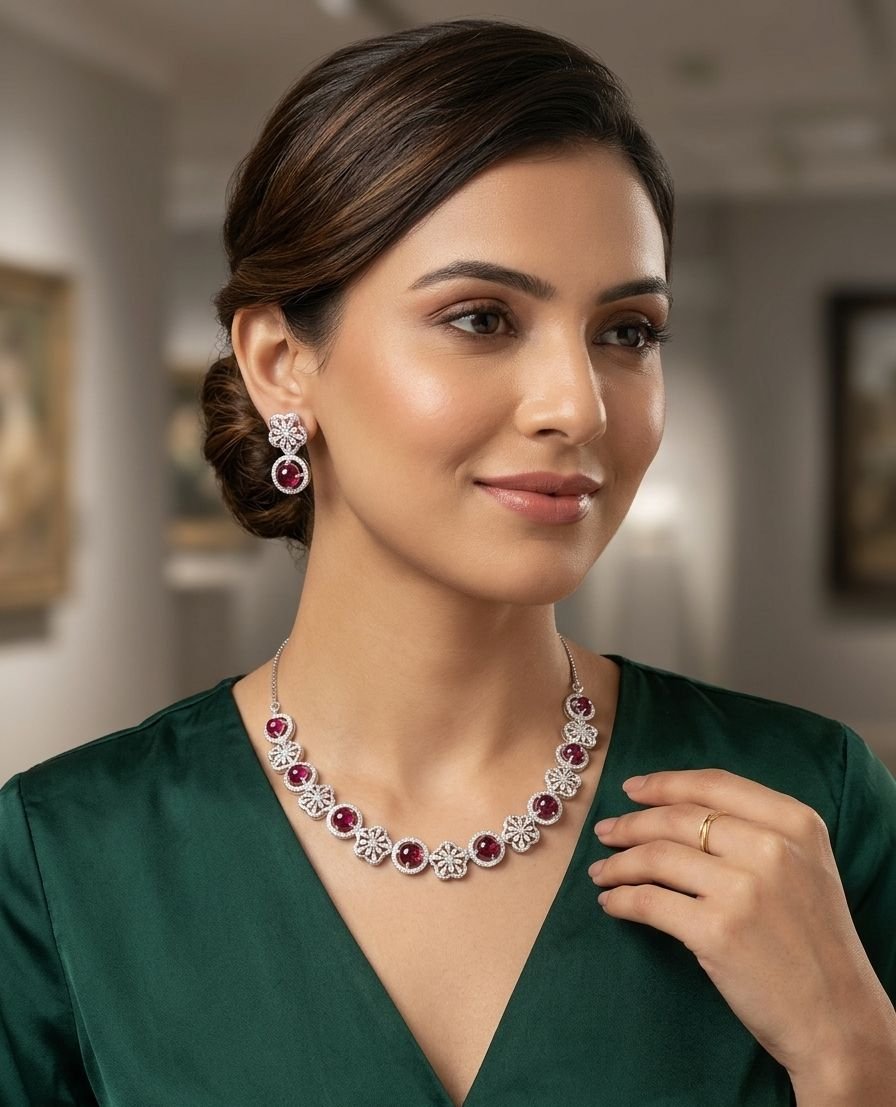 Ruby Red Floral Silver Necklace Set from Silveradda. Designed with intricate floral patterns and adorned with radiant ruby-red stones, this set perfectly blends elegance with modern sophistication. Whether it’s a wedding, festive celebration, or a special evening, this necklace set ensures you stand out with grace.