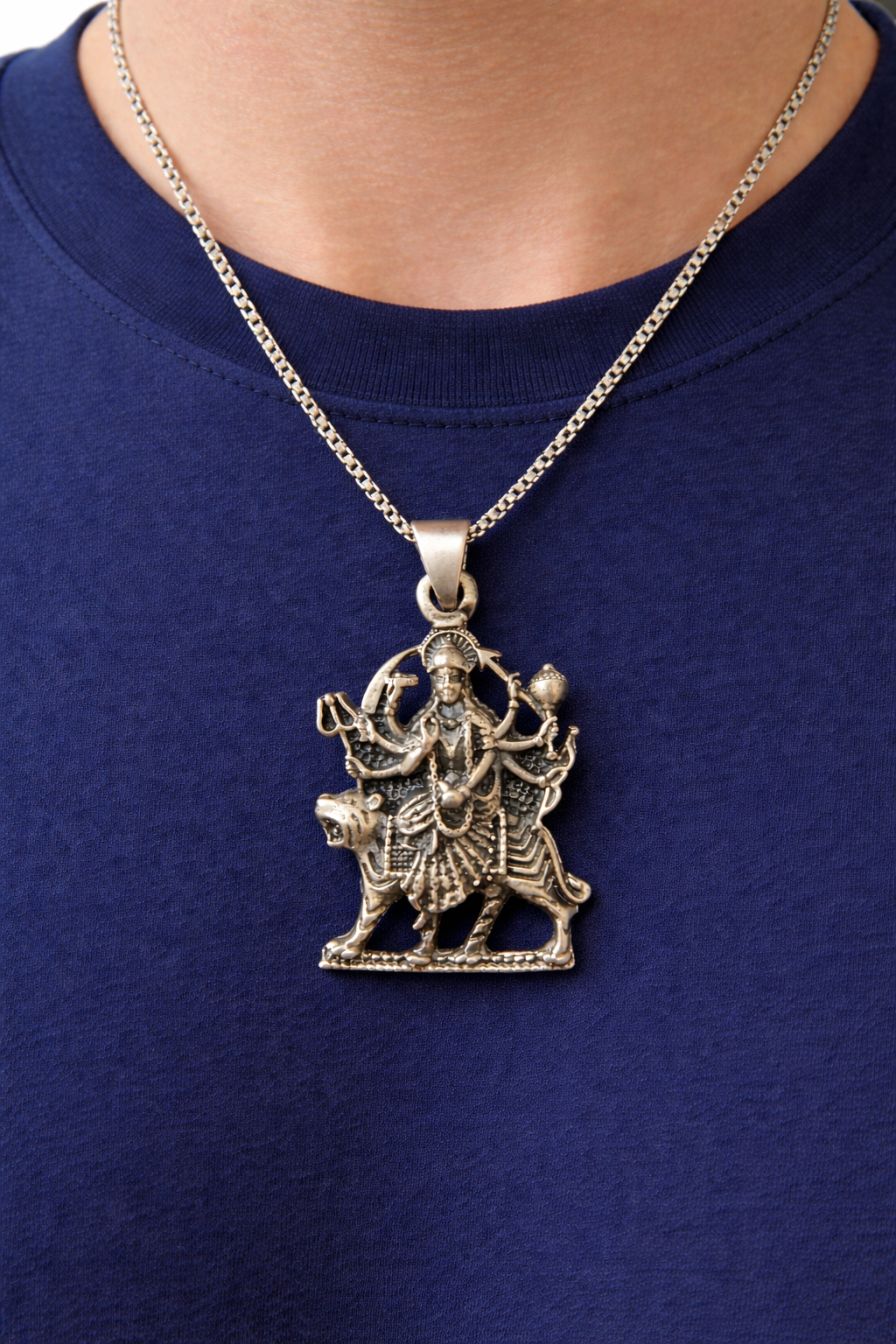 Sherawali Maa Durga Silver Pendant for Men is a powerful symbol of divine strength, courage, and protection. Inspired by the fierce and compassionate form of Durga, this pendant features intricate detailing of Maa Durga riding a lion, representing victory over evil. Perfect for devotees and style-conscious men, it blends spirituality with bold design.