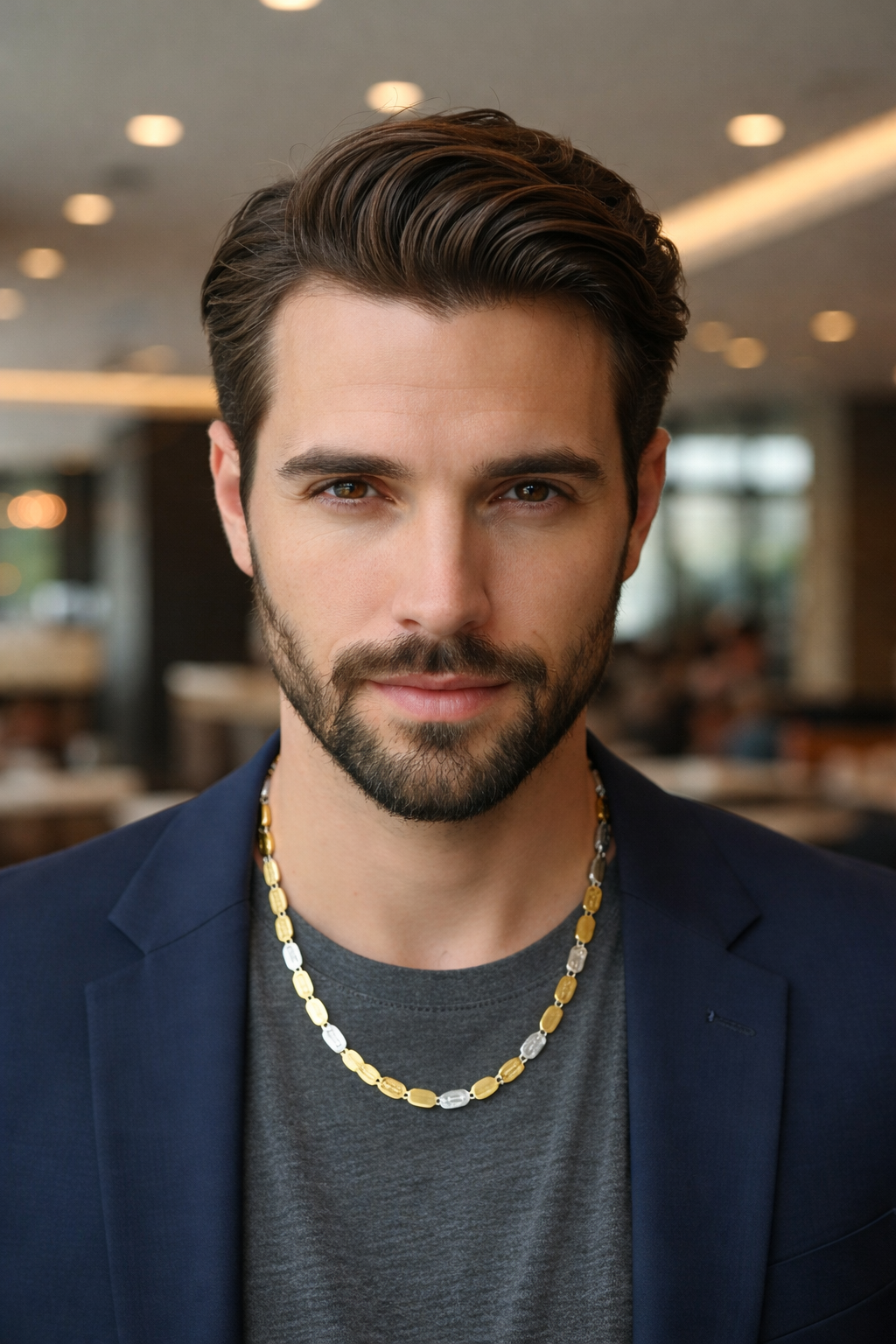 Upgrade your look with a touch of elegance. This stylish silver chain features a unique gold and silver finish, crafted in bold oval links that exude sophistication and modern style. Perfect for men who want to make a statement with versatile jewelry suitable for casual, formal, or festive occasions.
