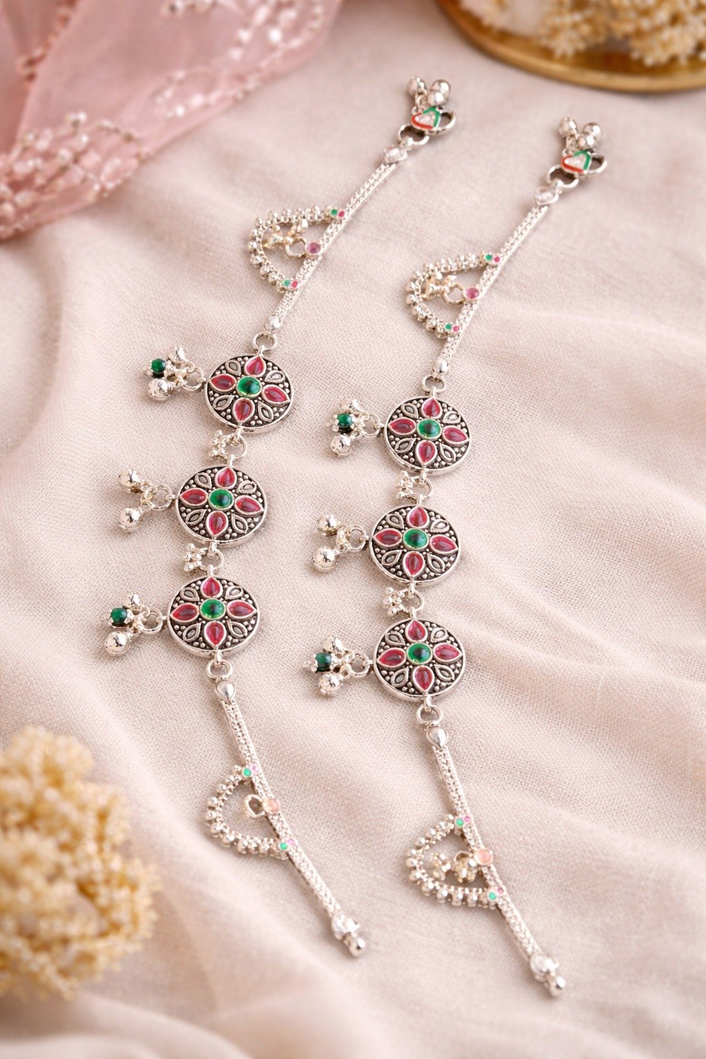 This multicolor floral silver anklet is ideal for various occasions. Whether you are dressing up for a festival, wedding function, or casual outing, it enhances your overall style effortlessly. Moreover, the combination of pink and green stones adds a vibrant and eye-catching appeal.
