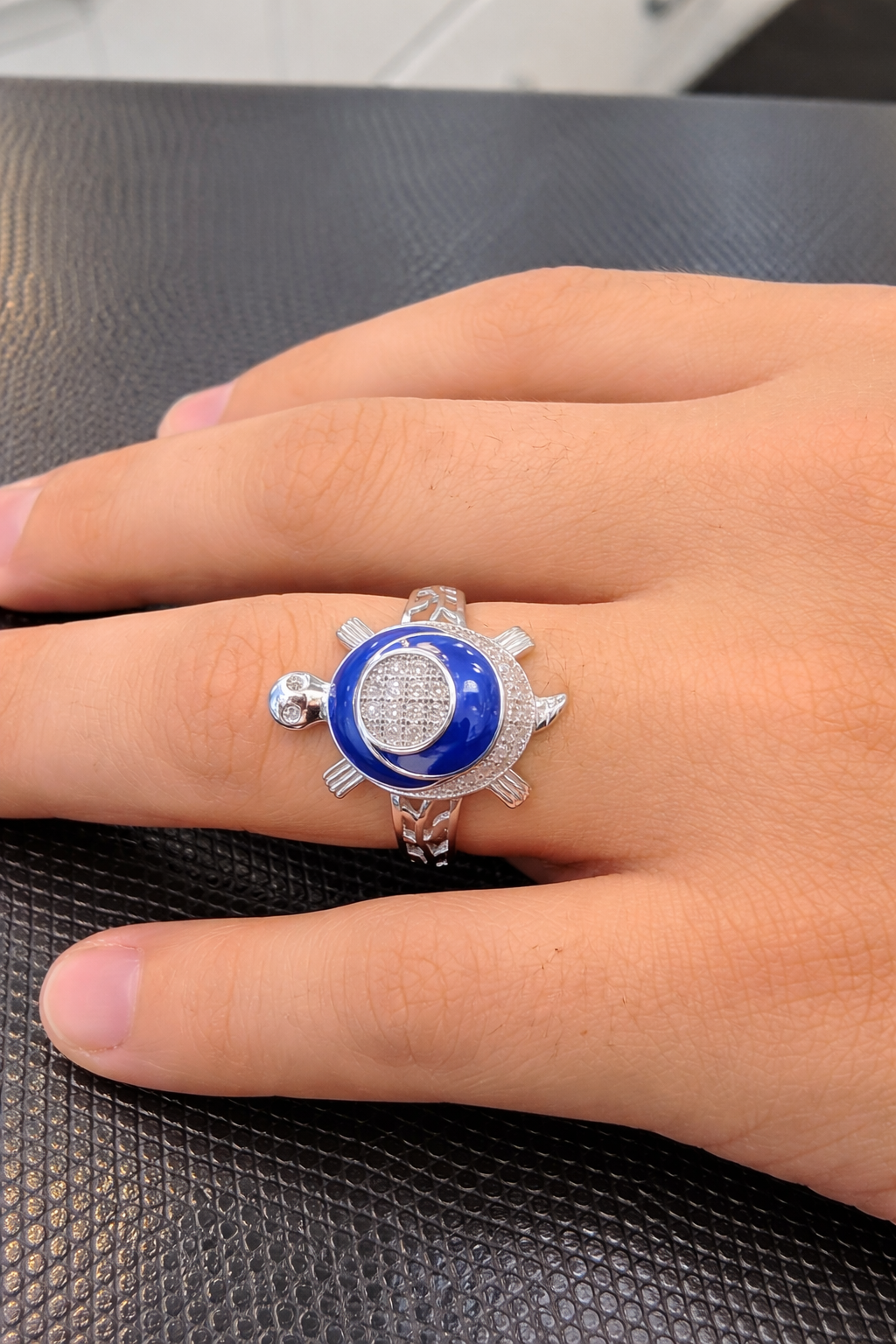 Blue Turtle Silver Ring. Designed for modern women, this unique ring features a charming turtle motif adorned with a vibrant blue stone and sparkling CZ accents, making it a perfect blend of style and meaning.