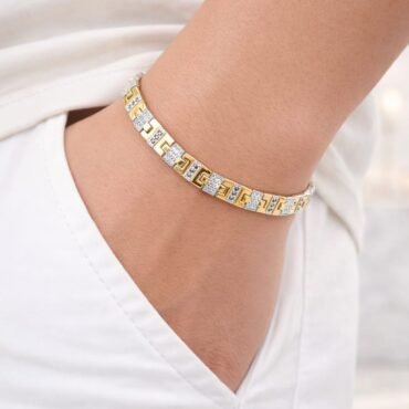 Original price was: ₹16,999.00.₹14,999.00Current price is: ₹14,999.00.Classic Gold & White Two-Tone Stone Designer Bracelet | Silveradda